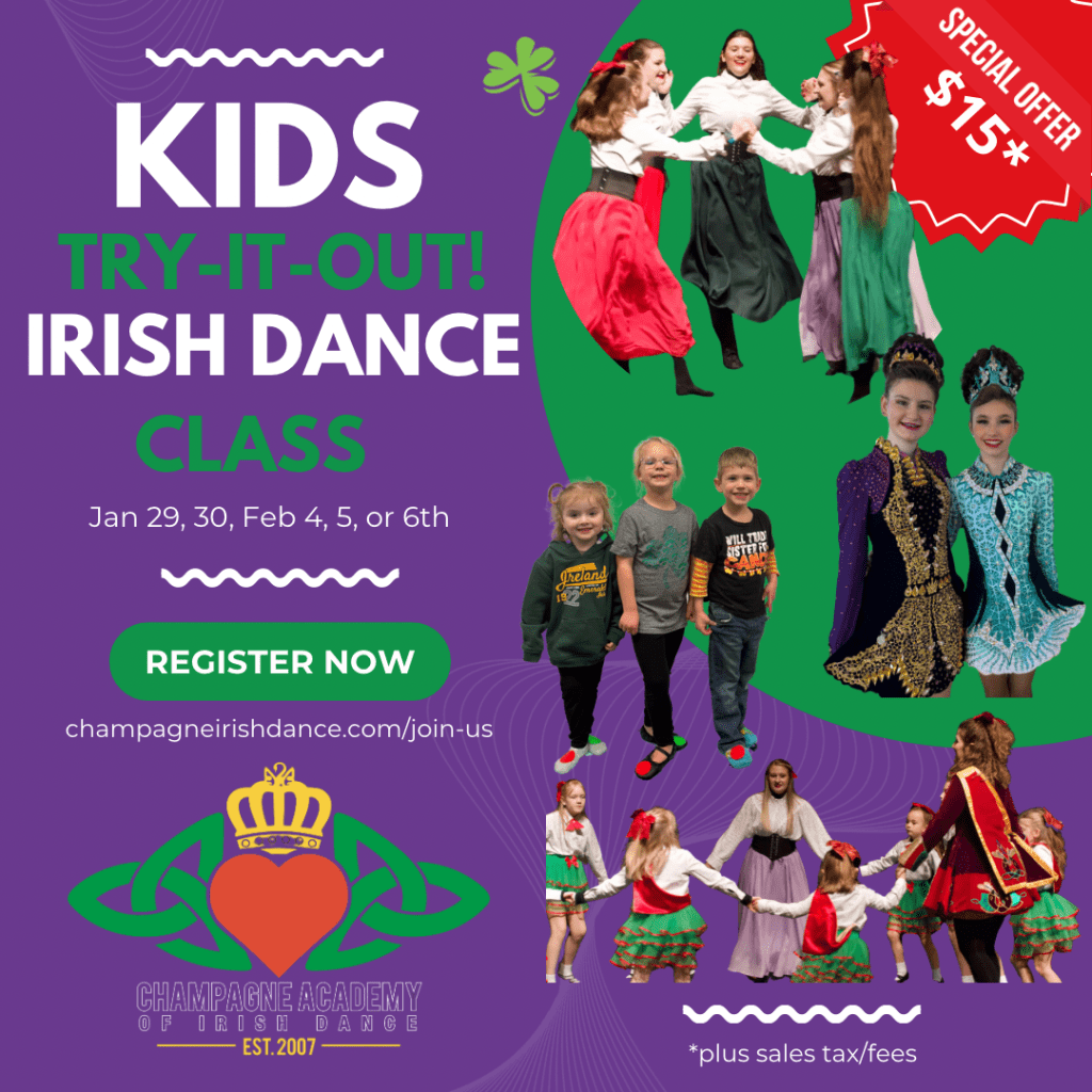 Go to champagneirishdance.com/join-us to view class times and to save your spot! $15* sales tax/fees are added to your total.